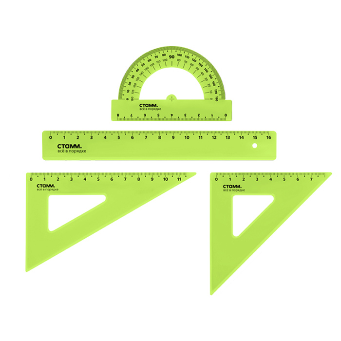 Набор чертёжный СТАММ S – отличный вариант для выполнения чертёжных и измерительных работ. Он включает в себя: линейку длиной 16 см, два треугольника 11/30°, 7/45° и транспортир 180°/8. Набор представлен в ярких неоновых цветах, цвет шкалы – чёрный. Все изделия в наборе имеют безопасные закруглённые углы и чёткую миллиметровую шкалу. Чертёжные принадлежности изготовлены из качественного полистирола. Чернила, используемые для нанесения шкалы на изделия, устойчивы к истиранию в процессе использования. Индивидуальная упаковка − пакет с европодвесом.