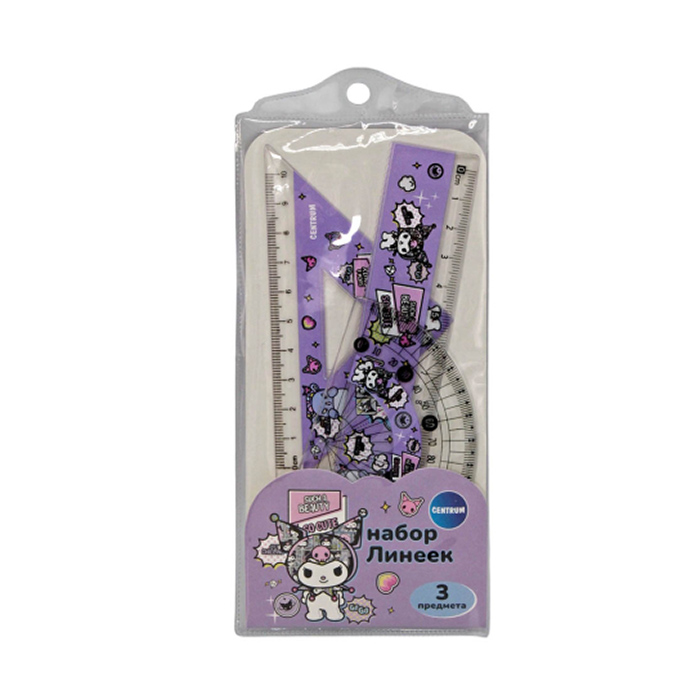 Набор линеек Centrum "Куроми и друзья". Мы знаем все о креативе. С оригинальной канцелярией и учиться в радость. В наборе: линейка длиной 15 см. с волнистой стороной для выделения необходимых частей текста; треугольник длиной - 10 см; транспортир 180 градусов. Крашеная поверхность устойчива к выцветанию и деформации. Качественная маркировка обеспечивает яркое и четкое нанесение информации для более четкого измерения. Упаковка: ПВХ-конверт с подвесом.