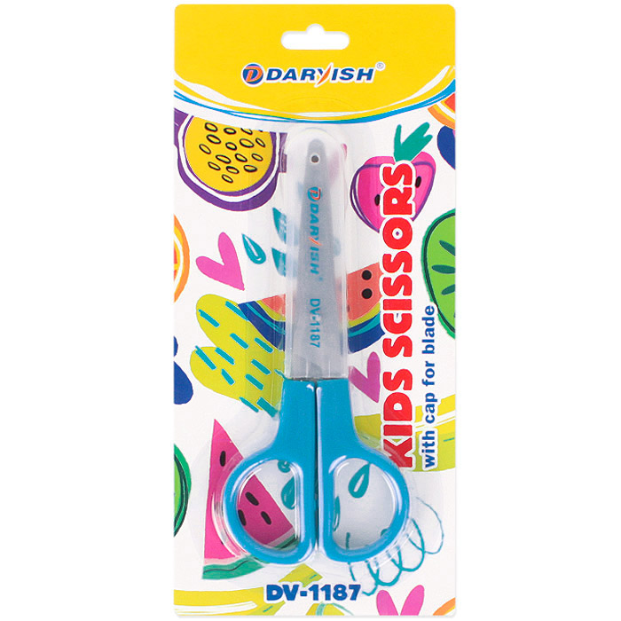 Ножницы с закруглёнными концами. Защитный колпачок для лезвий.Лезвия из нержавеющей стали, ручки пластиковые. Упаковка: блистер с европодвесом. 8*17,5*1см