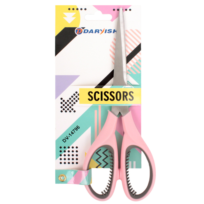 Ножницы канцелярские 20см .Хорошо заточенные зауженные лезвия из нержавеющей стали. Пластиковые ручки с рельефными резиновыми вставками. Цвет ручек:розовый. С европодвесом.9*20,5*1,5см