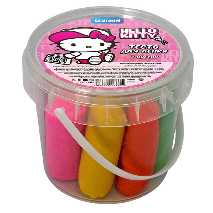 Тесто для лепки Centrum "Hello Kitty". Безопасное творчество и гармоничное развитие для малышей. Занятие лепкой – лучший тренажер для мелкой моторики, которая напрямую связана с речью, мышлением и координацией. Тесто мягкое, эластичное и приятное на ощупь. Материал не крошится, легко скрепляется между собой. Не липнет к рукам и не оставляет следов. Имеет приятный запах, безопасен для детей. Пластиковое ведерко обеспечит удобство при транспортировке и хранении, а также продлит срок службы материала. В наборе – тесто для лепки (7 цветов*30 грамм; 2 формочки)