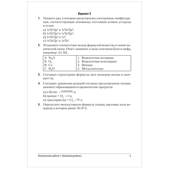 Сборник включает контрольные и самостоятельные работы по химии для 10 класса, представленные в четырех или двух (тесты) вариантах. Содержание работ соответствует учебным программам для базового и повышенного уровней.